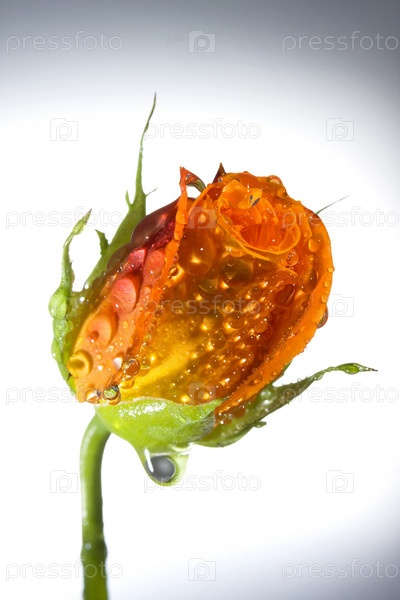Бутон розы в каплях воды на сером фоне