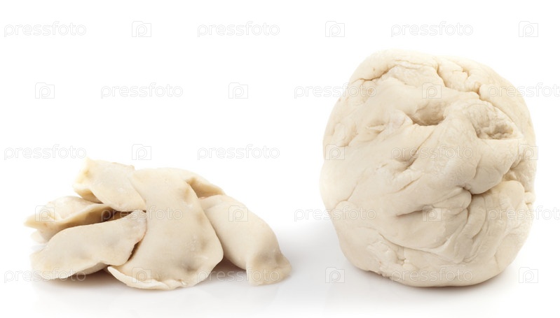 Комок сырого теста и сырые пельмени на белом фоне