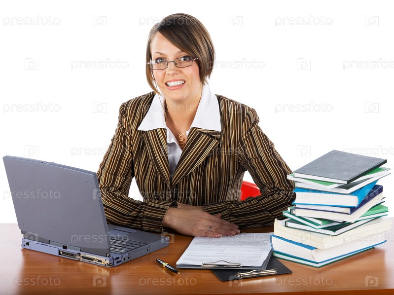 Молодая бизнес-леди с ноутбуком и книгами за столом