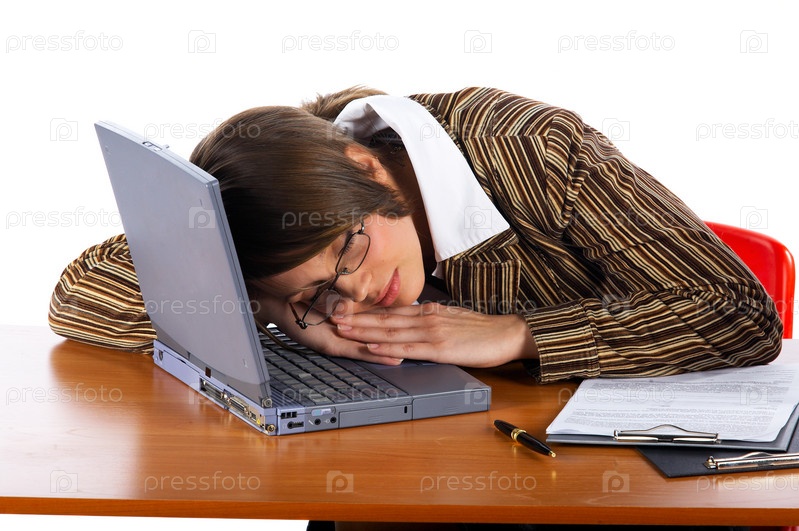 Молодая бизнес-леди спит на ноутбуке за столом