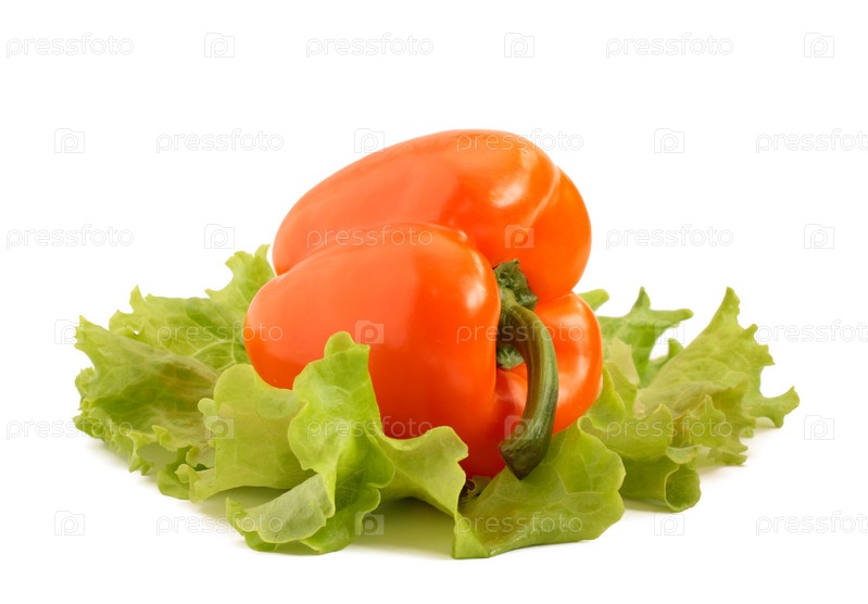 Свежий красный перец на листьях салата, изолированный на белом фоне