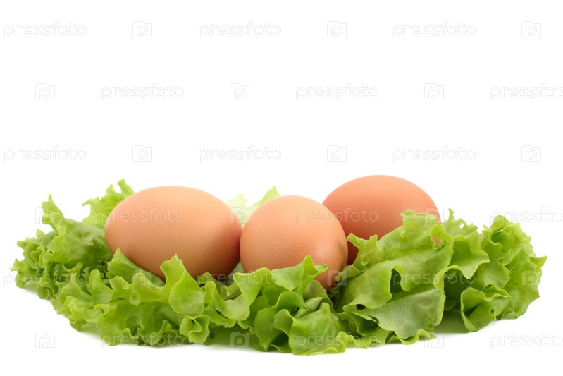 Куриные яйца на листьях салата, изолированные на белом фоне