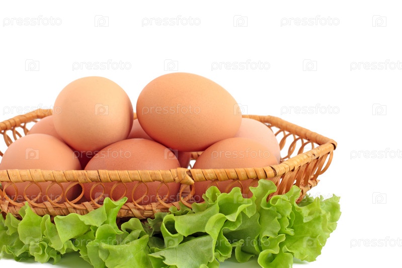 Яйца в корзине на листьях салата, изолированные на белом фоне