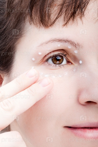 Женщина использует крем для век, лицо крупным планом