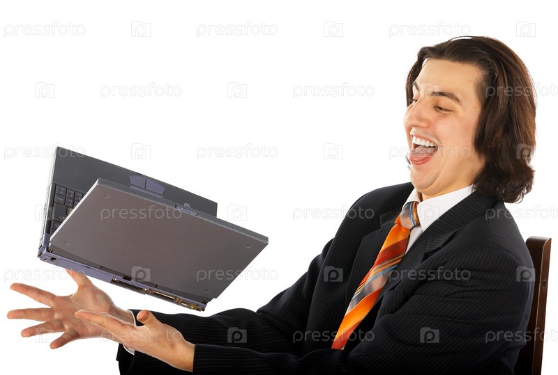 Счастливый бизнесмен подбрасывает ноутбук