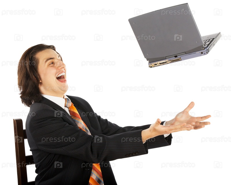 Счастливый бизнесмен подбрасывает ноутбук