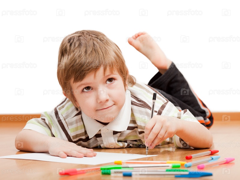 Маленький мальчик рисует, лежа на полу