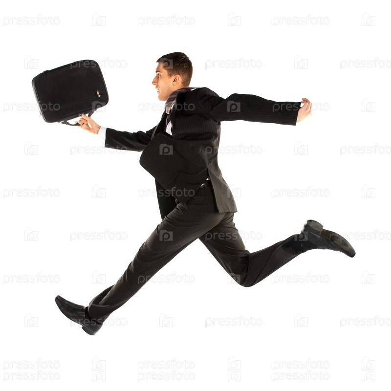 Подпрыгивающий молодой менеджер в костюме на белом фоне