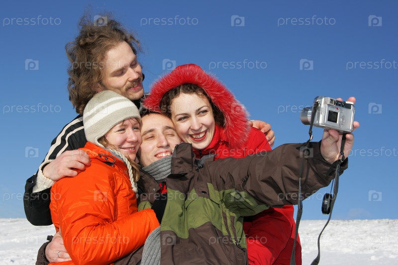Четверо друзей фотографируются на природе