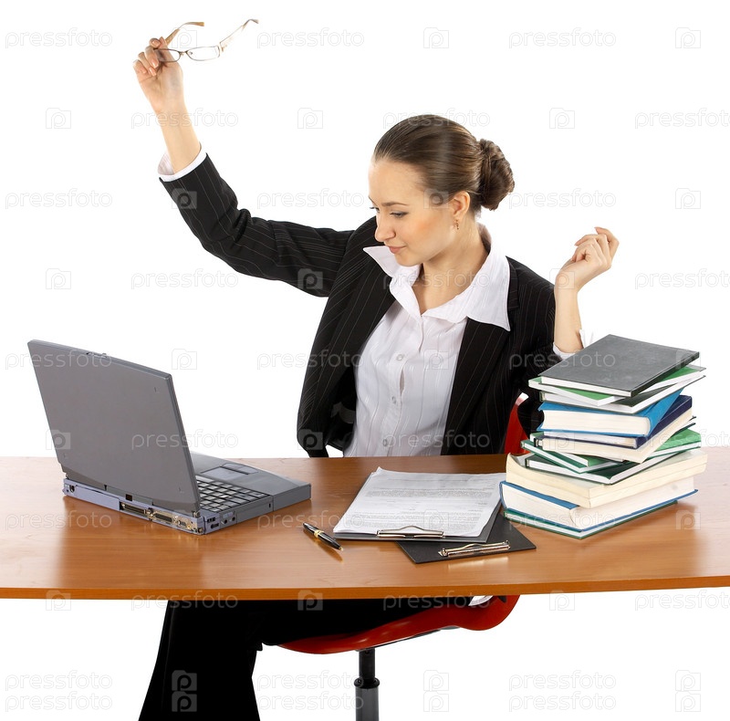 Бизнес-леди сидит за столом с ноутбуком и книгами