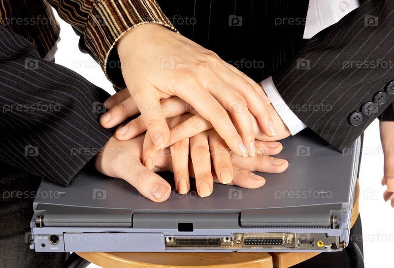 Руки бизнесменов сложены вместе на ноутбуке
