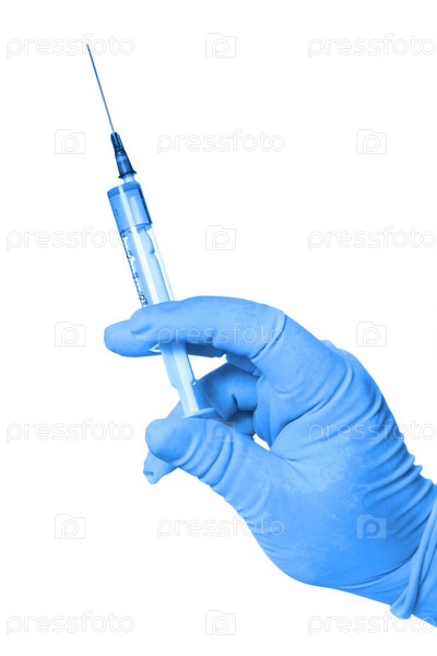 Рука в голубой перчатке держит шприц, крупный план на белом фоне