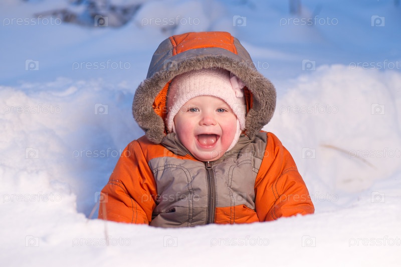 Маленький ребенок сидит в сугробе в парке