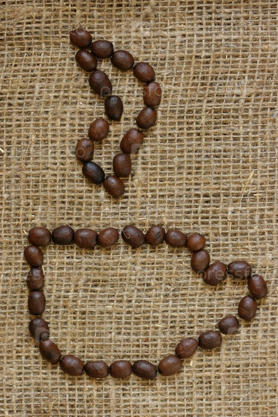 Чашка с кофе выложена из кофейных зерен на мешковине