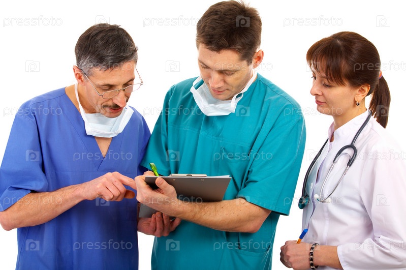 Трое врачей с планшетом на белом фоне