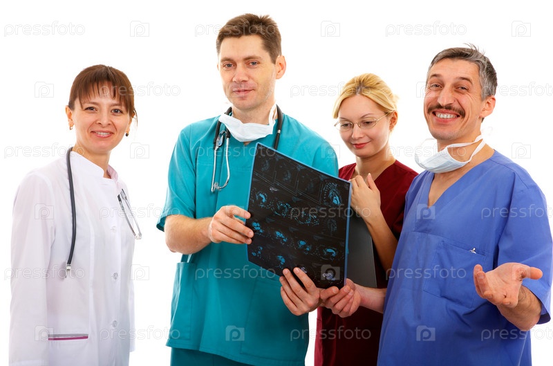 Медицинская бригада из двух мужчин и двух женщин с рентгеновским снимком
