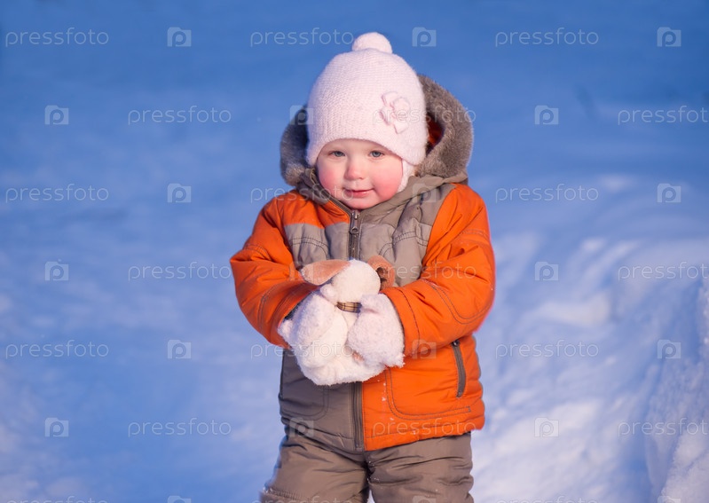 Маленькая девочка с мягкой игрушкой в зимнем парке