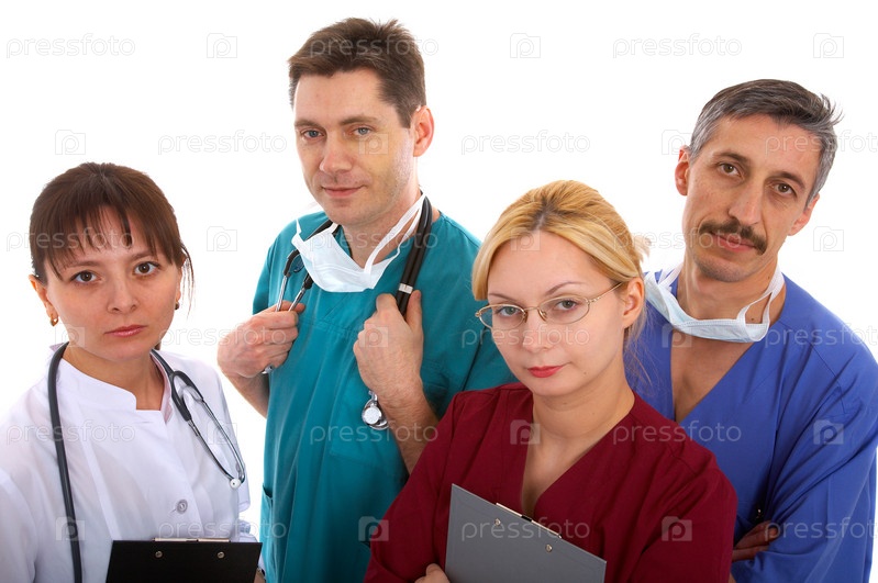 Медицинская бригада из четырех врачей на белом фоне