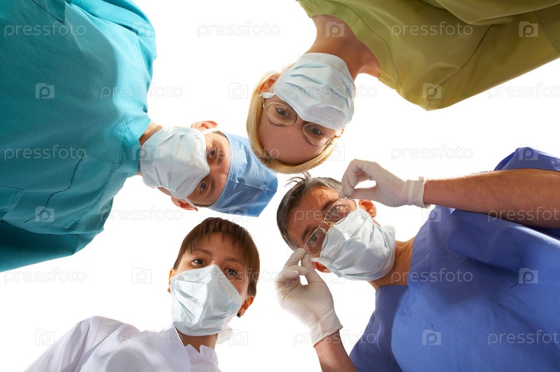 Бригада врачей в медицинских перчатках и масках на белом фоне