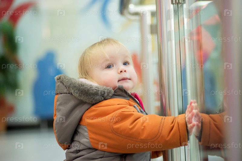 Маленький ребенок у стеклянной стены в магазине