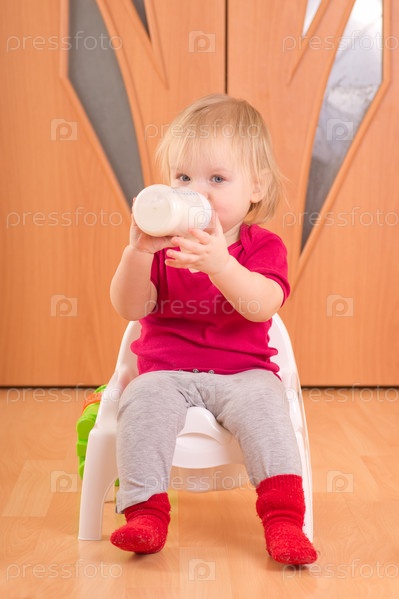 Маленький ребенок пьет молоко из бутылочки, сидя на стульчике
