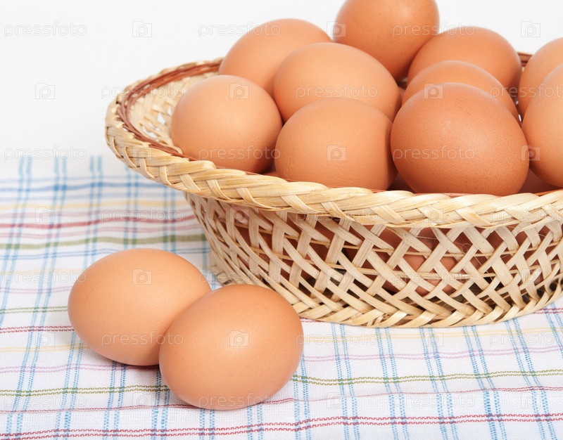 Яйца в плетеной тарелке на столе
