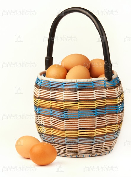 Корзина с яйцами на белом фоне