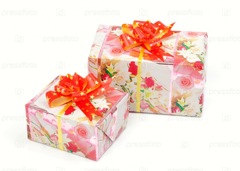 Два подарка в бумажных коробках с бантами на белом фоне
