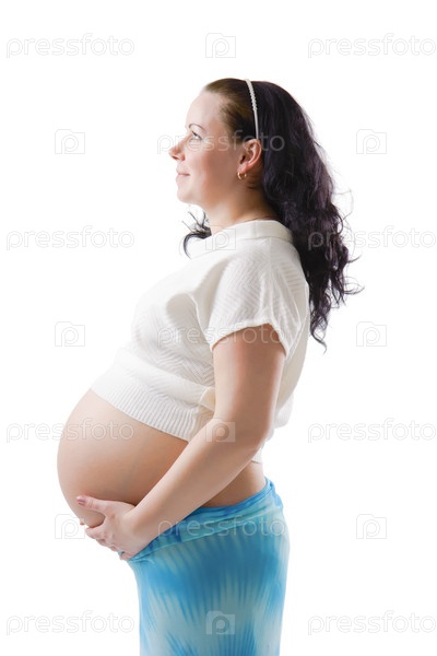 Счастливая беременная женщина на белом фоне