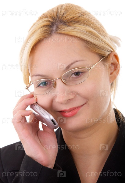 Блондинка в черном костюме с мобильным телефоном
