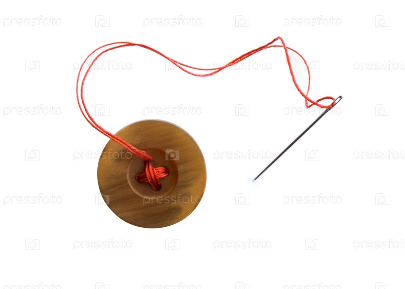 Пуговица и иголка с ниткой на белом фоне