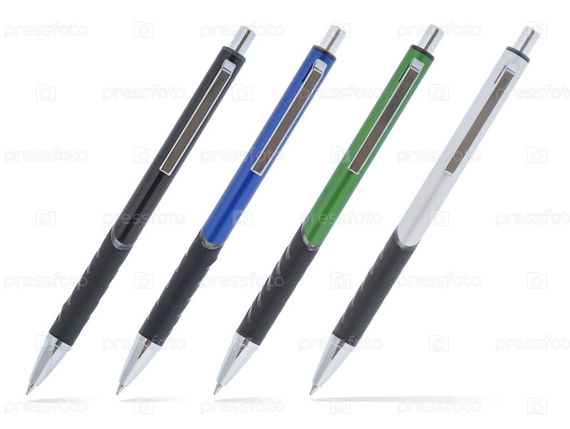 Ручка с шариковой точкой (или роликовым шаром), изолированная на белом фоне.Черный, синий, зеленый и серый варианты.Включен путь вырезания