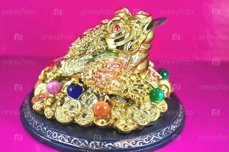 Золотая лягушка держит во рту монету