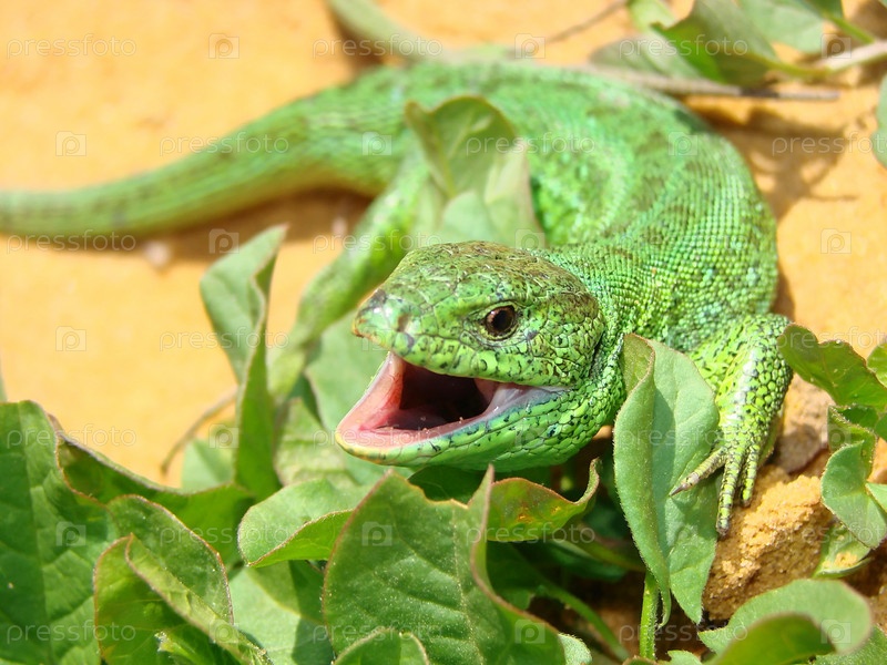 Ящерица на фоне зеленых листьев и песка