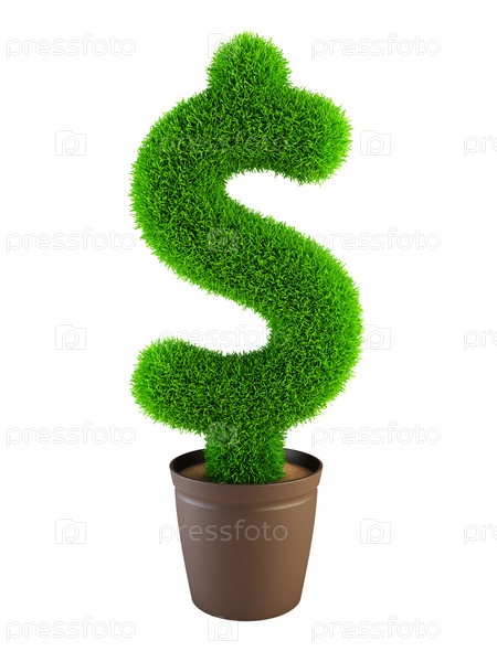Символ доллара, растущий в цветочном горшке на белом фоне