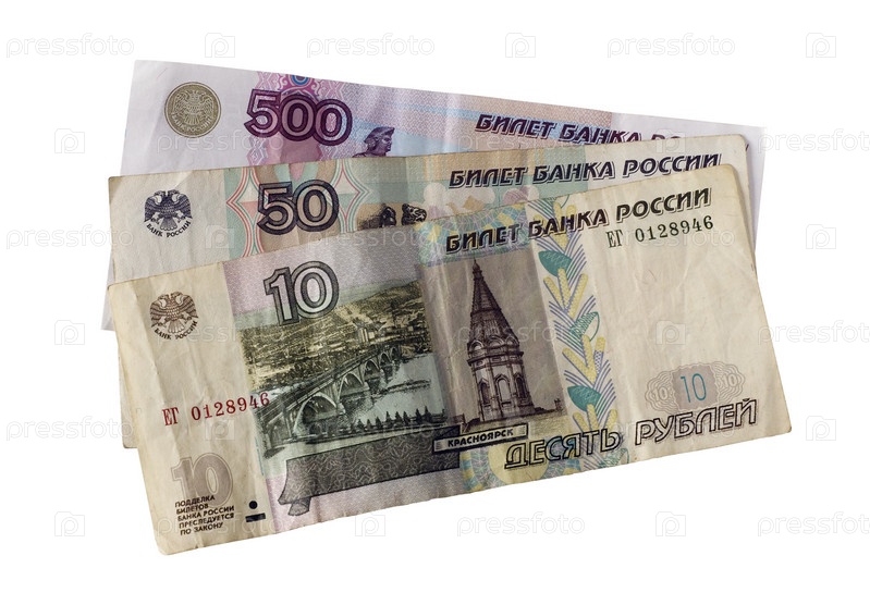 Бумажные купюры российских рублей на белом фоне