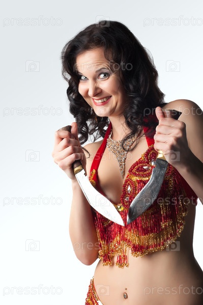 Женщина танцует в традиционном арабском костюме с кинжалами