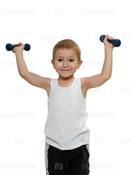 Ребенок тренируется с гантелями