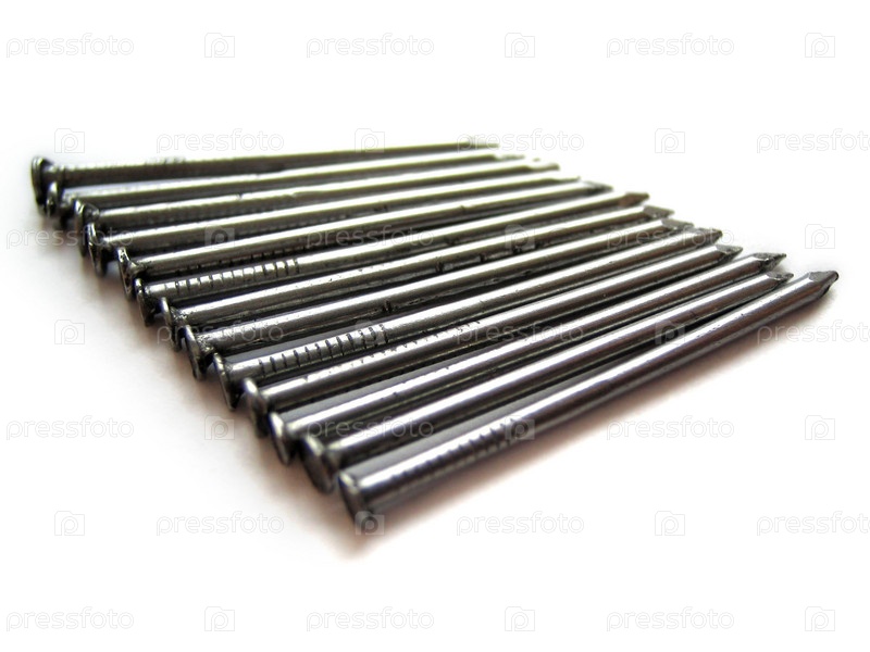 Гвозди лежат в ряд на белом фоне
