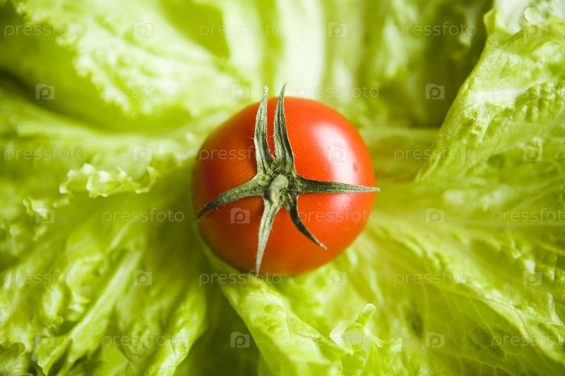 Помидор на фоне из листьев салата