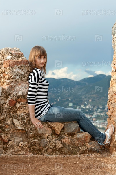Девушка у стены старой крепости