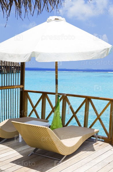 Зонтик и шезлонги на веранде, Мальдивы