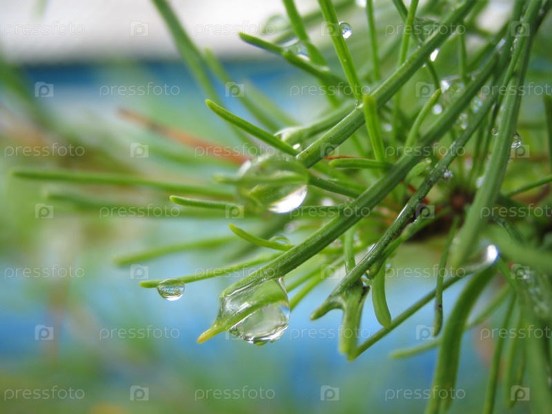 Еловая ветка с каплями воды