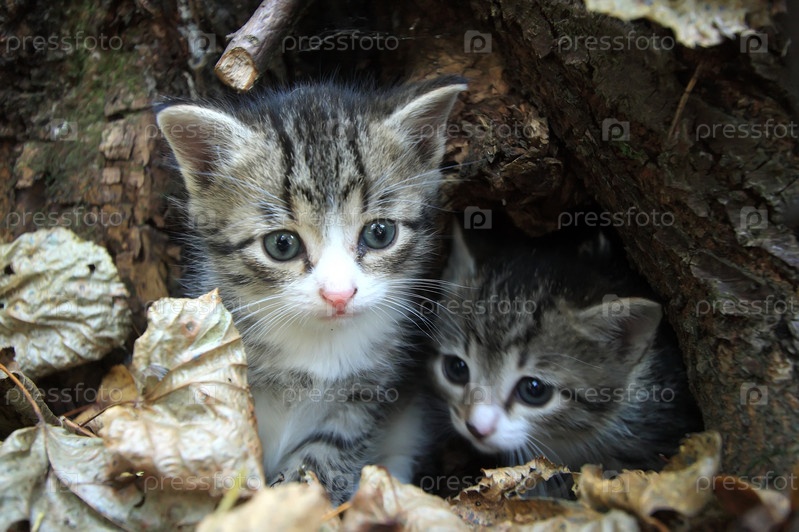 Кошка с котятами в осеннем лесу