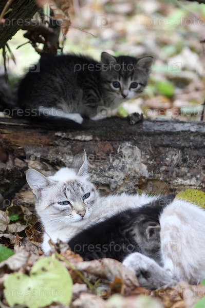 Кошка с котятами в осеннем лесу