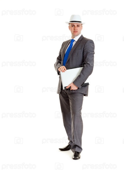 Портрет молодого бизнесмена в шляпе с ноутбуком