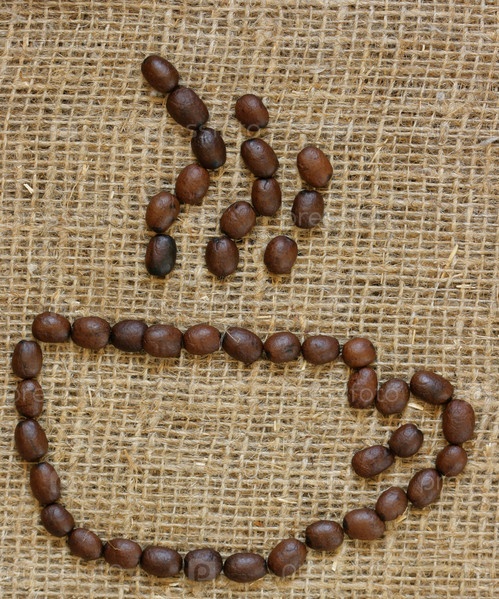 Очертание чашки из кофейных зерен на фоне мешковины
