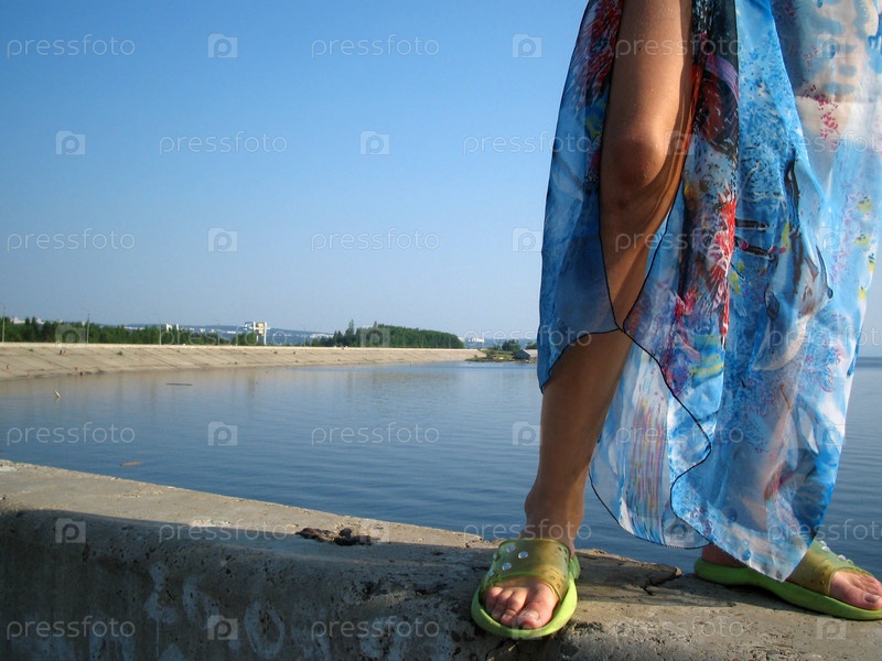 Женские стройные загорелые ноги в сланцах на фоне водоема