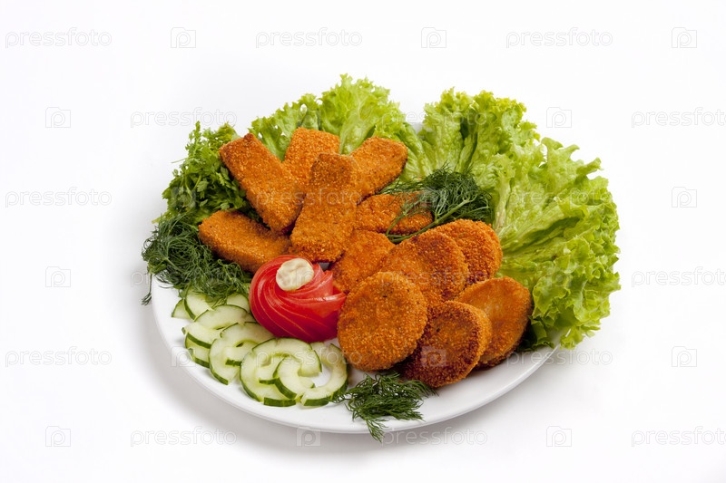 Мясная закуска с овощами на белом фоне
