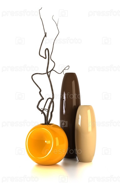 Три вазы и ветка, изолированные на белом фоне